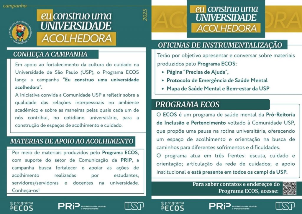 Venha conhecer o Programa ECOS São Carlos e a campanha "Eu construo uma Universidade Acolhedora", participando de uma Oficina de Instrumentalização para suporte a ações de acolhimento.
